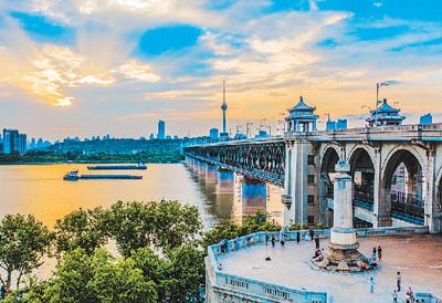 湖北武漢長江大橋,在晚霞的映照下,與長江構(gòu)成一幅美麗的畫卷。趙廣亮攝(人民圖片)
