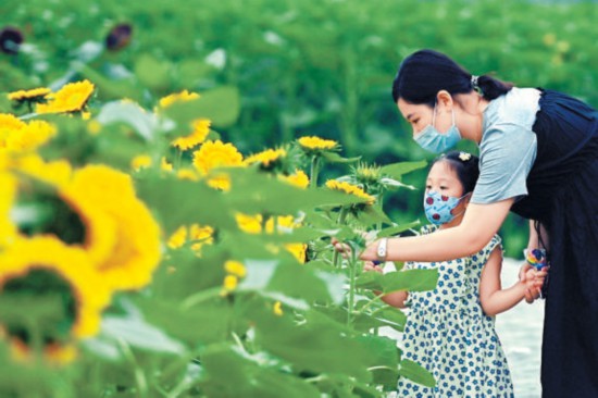 昨天,奧林匹克森林公園北園西門附近的“花田野趣”景區(qū),部分品種的向日葵競(jìng)相綻放,吸引不少市民前來(lái)打卡拍照。 本報(bào)記者 程功攝