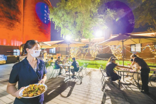 首鋼大食堂背后的巨大筒倉被紅色燈光照亮,游客在室外愜意就餐。本報記者 鄧偉攝