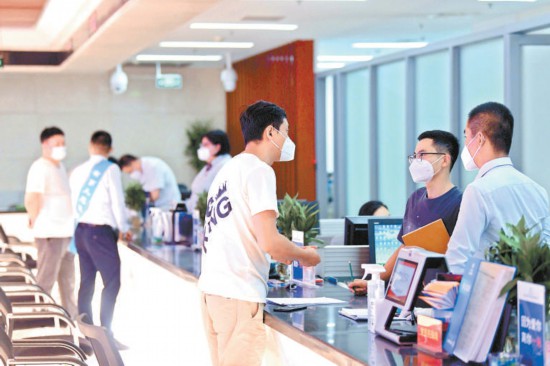 昨天,北京經(jīng)濟(jì)技術(shù)開發(fā)區(qū)政務(wù)服務(wù)大廳,工作人員正在熱情接待企業(yè)代表辦理相關(guān)業(yè)務(wù)。本報記者 和冠欣攝