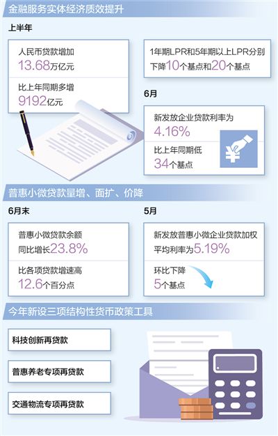 數(shù)據(jù)顯示,上半年,我國社會融資規(guī)模增量為21萬億元,同比多增3.2萬億元,人民幣貸款增加13.68萬億元,比上年同期多增9192億元。與此同時,央行持續(xù)釋放貸款市場報(bào)價(jià)利率(LPR)改革潛力,1年期LPR和5年期以上LPR分別下降10個基點(diǎn)和20個基點(diǎn),6月份新發(fā)放企業(yè)貸款利率為4.16%,比上年同期低34個基點(diǎn),企業(yè)綜合融資成本穩(wěn)中有降,金融服務(wù)實(shí)體經(jīng)濟(jì)的質(zhì)量和效率明顯提升。