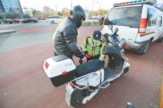 菜市口路口,西城區(qū)交通支隊民警對私自改裝電動自行車的違法行為進行查處。本報記者 甘南攝(資料片)