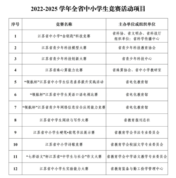 江蘇公布2022-2025學(xué)年中小學(xué)生競賽活動項目