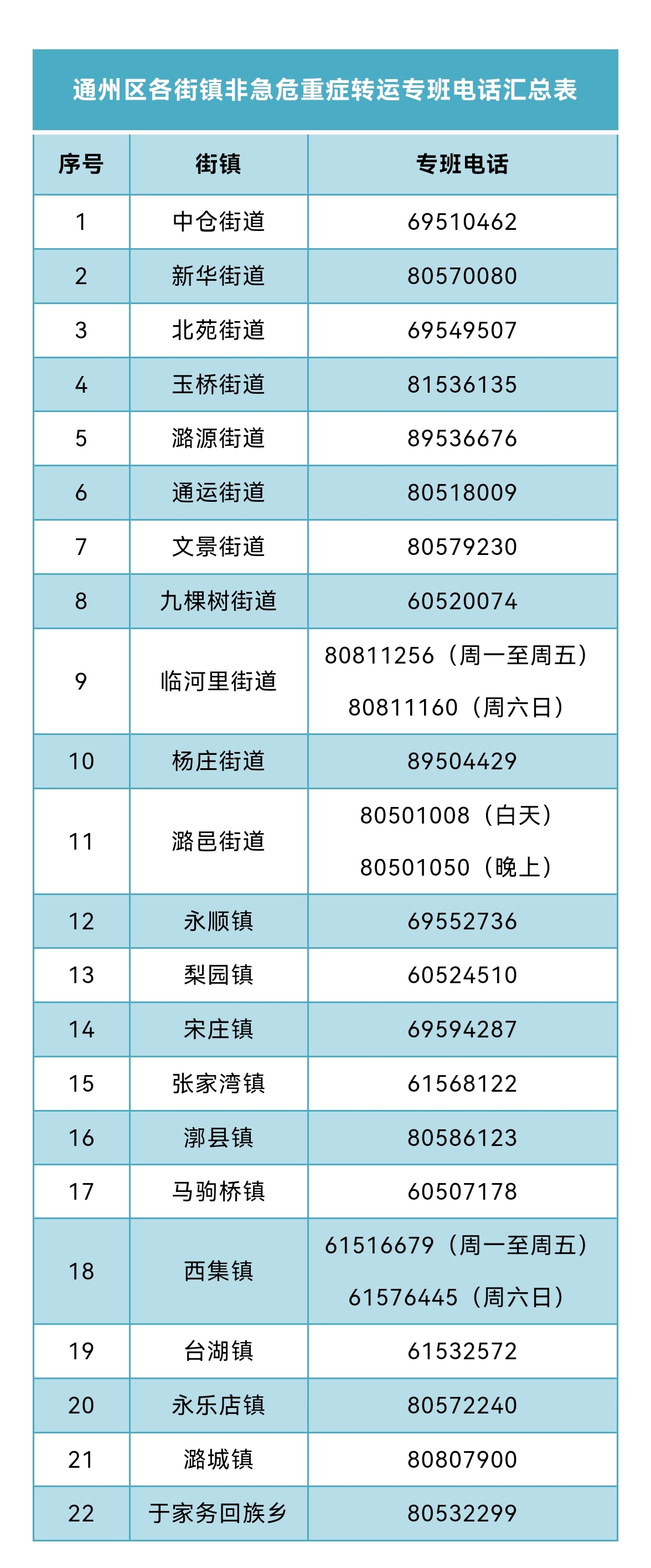 人民網(wǎng)北京12月21日電 為進(jìn)一步保障非急危重癥群眾就醫(yī)需求,不擠占120醫(yī)療急救資源,暢通就醫(yī)出行通道,將120救護(hù)車留給急危重癥患者,北京市通州區(qū)向社會公布各街道鄉(xiāng)鎮(zhèn)非急危重癥轉(zhuǎn)運(yùn)專班熱線電話(具體熱線電話見下表)。