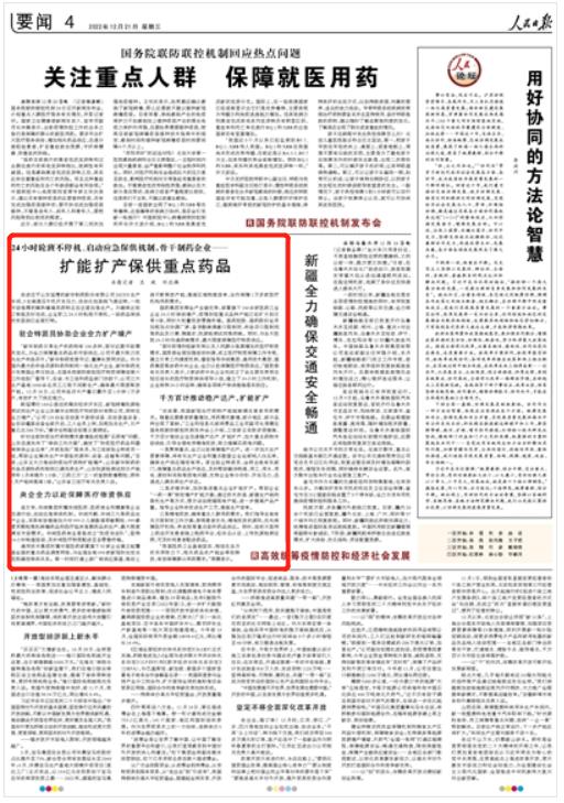 針對當前防疫治療藥物需求激增造成短期“買藥難”問題,山東迅速發(fā)布了“保供工作方案”,確定了“防疫醫(yī)療藥品和器械保供企業(yè)名單”,并派駐駐廠服務員,與工信部駐企特派員一起,幫助企業(yè)解決生產中面臨的原料、設備、運輸等問題?!澳壳?,山東正大力推動防疫治療藥物擴能增產,山東新華制藥的布洛芬原料藥和制劑已滿負荷生產,山東抗原檢測試劑日產能明年1月將提升1.5倍,‘三藥三方’之一的宣肺敗毒顆粒,明年1月產能將提高1倍。”山東省工信廳有關負責人說。