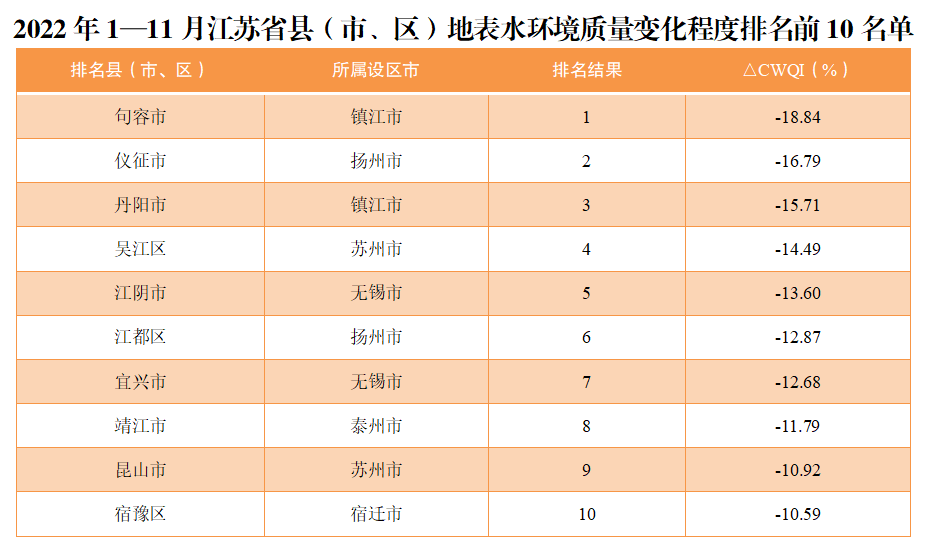 地表水環(huán)境質(zhì)量改善幅度相對較快的前10位(1—10名)依次是句容市、儀征市、丹陽市、吳江區(qū)、江陰市、江都區(qū)、宜興市、靖江市、昆山市、宿豫區(qū)。