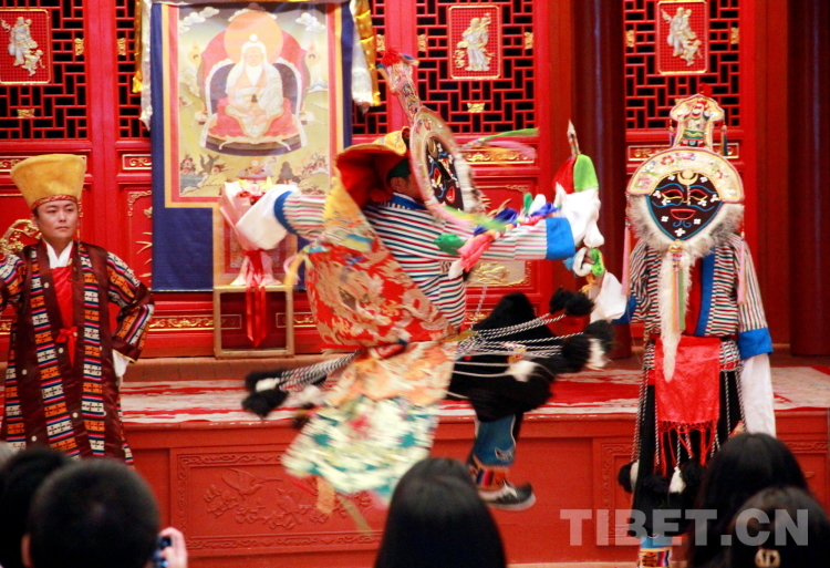 圖為拉薩市城關(guān)區(qū)娘熱民間藝術(shù)團(tuán)演員多吉次仁表演國(guó)家級(jí)非物質(zhì)文化遺產(chǎn)“嘎?tīng)枴睌z影:劉莉
