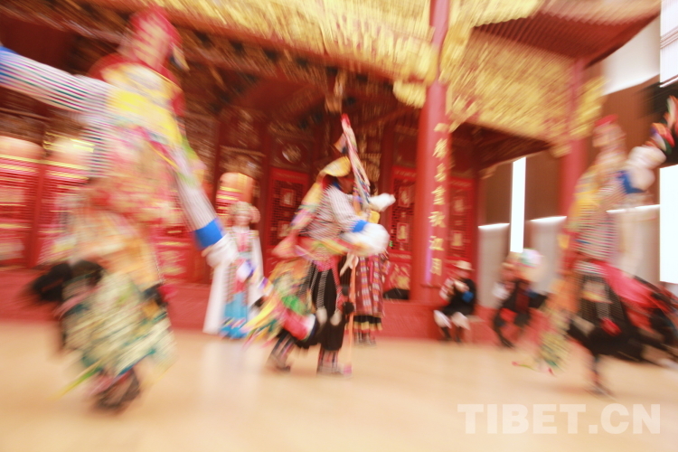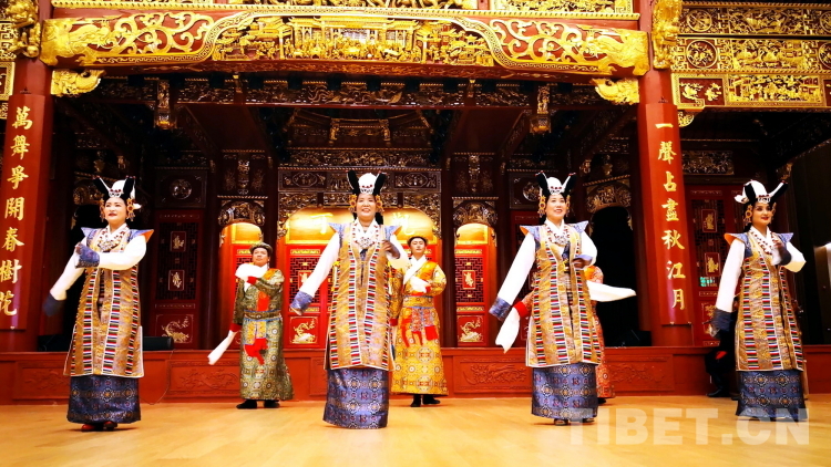 圖為拉薩市城關(guān)區(qū)娘熱民間藝術(shù)團(tuán)演員表演國(guó)家級(jí)非物質(zhì)文化遺產(chǎn)“嘎?tīng)枴睌z影:劉莉