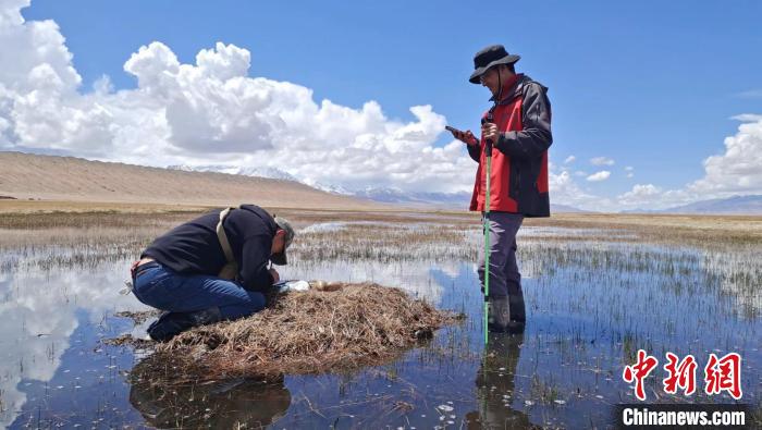 圖為楊巨才(右)在甘肅酒泉市肅北縣黨河濕地開(kāi)展黑頸鶴巢位監(jiān)測(cè)工作。(資料圖) 受訪者供圖