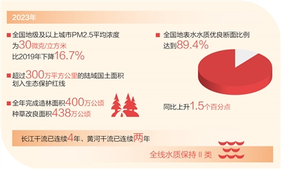 2023年,全國(guó)地級(jí)及以上城市PM2.5平均濃度為30微克/立方米,比2019年下降16.7%;全國(guó)地表水水質(zhì)優(yōu)良斷面比例達(dá)到89.4%,同比上升1.5個(gè)百分點(diǎn);超過(guò)300萬(wàn)平方公里的陸域國(guó)土面積劃入生態(tài)保護(hù)紅線。