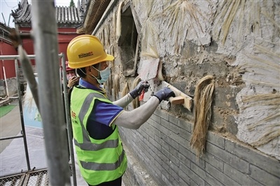 2021年9月16日,萬壽寺二期修繕工地,工人正在對墻體進(jìn)行修繕。新京報(bào)記者 鄭新洽 攝