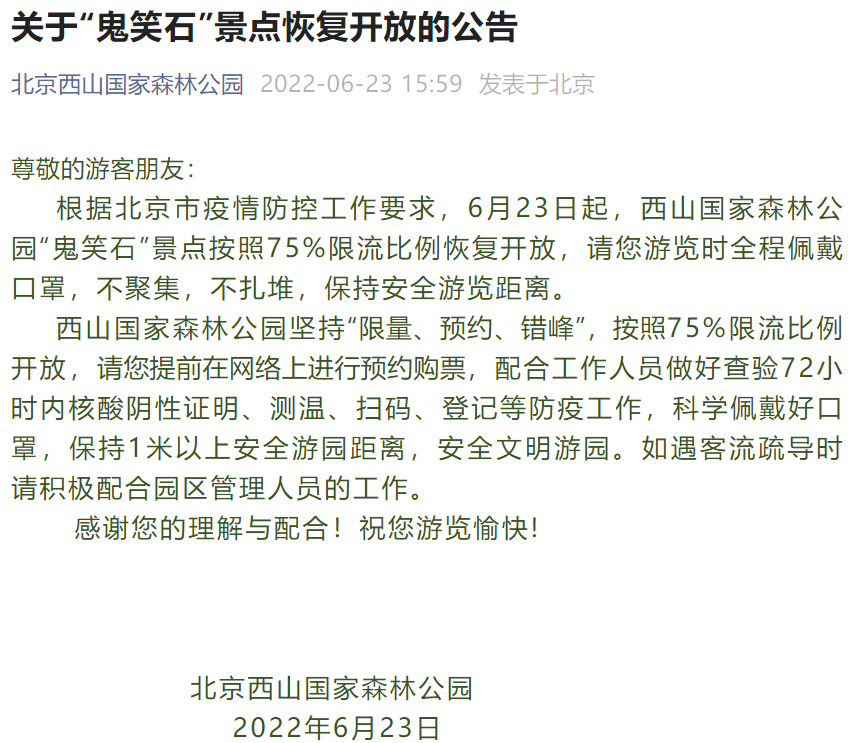 央廣網(wǎng)北京6月23日消息 據(jù)北京西山國家森林公園微信公眾號消息,根據(jù)北京市疫情防控工作要求,自6月23日起,西山國家森林公園“鬼笑石”景點按照75%限流比例恢復(fù)開放。