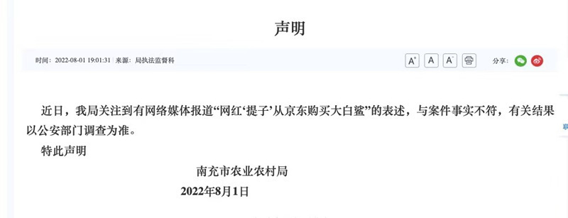 事件被越來(lái)越多人關(guān)注,公安部門已經(jīng)介入。平臺(tái)地址顯示“提子”位于四川南充,當(dāng)?shù)剞r(nóng)業(yè)農(nóng)村局的工作人員2日下午向記者證實(shí),已將涉事鯊魚(yú)送往鑒定機(jī)構(gòu)。“我們之前執(zhí)法監(jiān)督科送檢了一部分,這個(gè)案件現(xiàn)在是刑事案件,公安機(jī)關(guān)在這邊處理。”