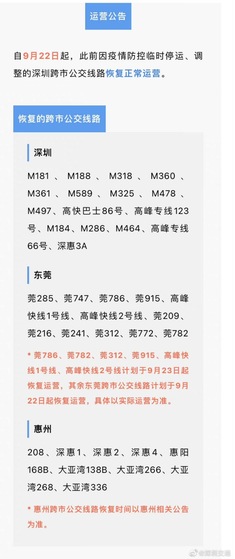央廣網北京9月22日消息 據深圳市交通運輸局官方微博消息,自9月22日起,此前因疫情防控臨時停運、調整的深圳跨市公交線路恢復正常運營,本次恢復運營的具體線路如下圖所示: