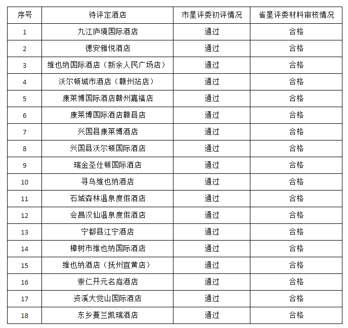 央廣網(wǎng)北京10月11日消息 據(jù)江西省文化和旅游廳消息,江西省星評(píng)委依據(jù)《旅游飯店星級(jí)的劃分與評(píng)定》(GB/T14308-2010)國(guó)家標(biāo)準(zhǔn)的相關(guān)要求,經(jīng)過相關(guān)酒店企業(yè)申請(qǐng),相關(guān)評(píng)定委員會(huì)評(píng)定,現(xiàn)將待評(píng)四星級(jí)旅游飯店的十八家酒店進(jìn)行評(píng)定前公示。