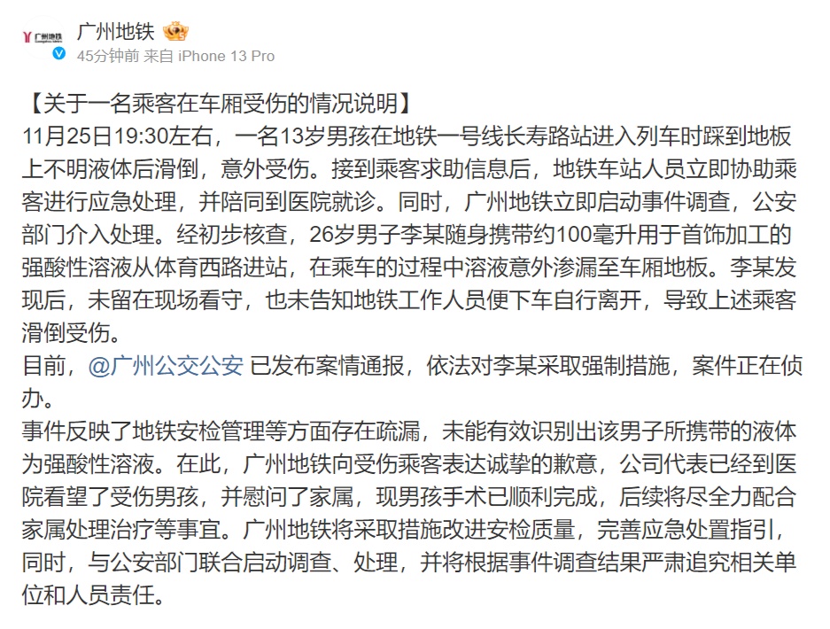 廣州地鐵方面表示,事件反映了地鐵安檢管理等方面存在疏漏,未能有效識(shí)別出該男子所攜帶的液體為強(qiáng)酸性溶液,向受傷乘客表達(dá)誠(chéng)摯的歉意。廣州地鐵公司代表已經(jīng)到醫(yī)院看望了受傷男孩,并慰問(wèn)了家屬,現(xiàn)男孩手術(shù)已順利完成,后續(xù)將盡全力配合家屬處理治療等事宜。