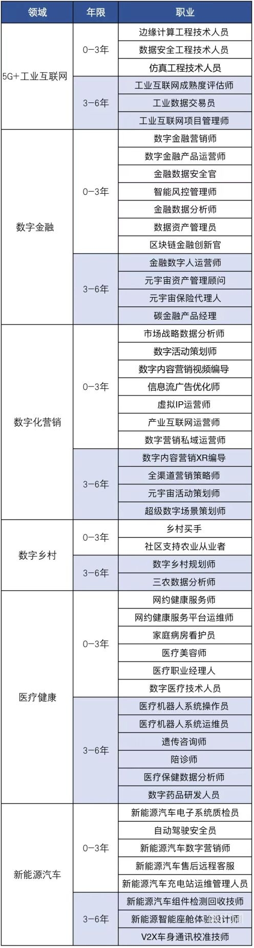 此次發(fā)布的52個未來職業(yè)“高清畫像”,涉及涵蓋醫(yī)療健康、5G+工業(yè)互聯(lián)網(wǎng)、數(shù)字化營銷、數(shù)字金融、數(shù)字鄉(xiāng)村、新能源汽車等六大領(lǐng)域,依據(jù)發(fā)展成熟度分為0-3年與3-6年兩個階段,既可以看到新技術(shù)、新業(yè)態(tài)和新模式場景下,原有職業(yè)內(nèi)涵發(fā)生變化的更新性職業(yè),也可以看到全新職業(yè)類型,不僅明確了職業(yè)定義,細(xì)化了主要工作任務(wù),更進一步列出了具體技能要求清單。