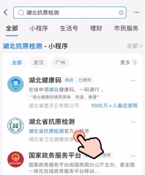 1.首先打開支付寶,搜索“湖北抗原檢測”,點(diǎn)擊“湖北省抗原檢測官方小程序”,進(jìn)入“個(gè)人檢測上報(bào)”。