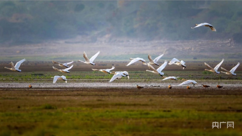 央廣網(wǎng)都昌12月29日消息(記者鄧玉玲)元旦前夕,在江西鄱陽湖都昌大沔池水域,數(shù)百只小天鵝自由自在地徜徉于湖畔淺灘。