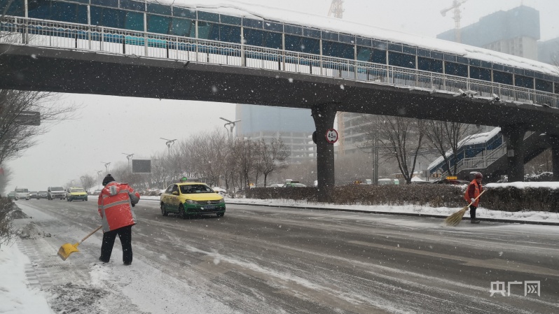 在新疆烏魯木齊市,工作人員正在清理道路積雪(央廣網(wǎng)記者羅成 攝)