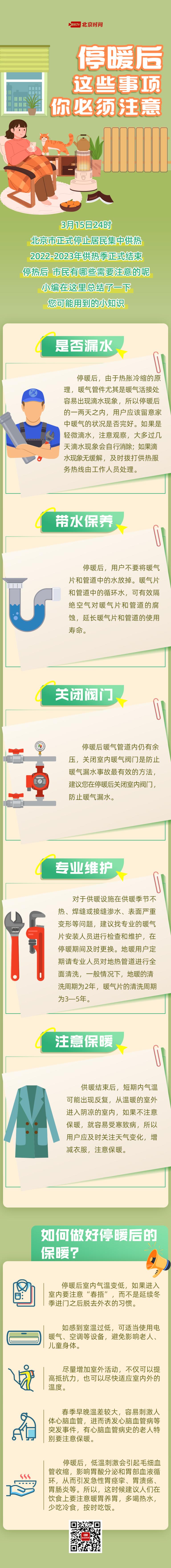 今日(16日)起,北京市正式停止居民集中供熱,都有哪些注意事項(xiàng)?首先要做好供熱設(shè)備的維護(hù),包括及時(shí)檢測(cè)暖氣管道是否漏水,不要放掉暖氣管道中的水,停暖后及時(shí)關(guān)閉室內(nèi)閥門(mén)并安排專業(yè)人員對(duì)供暖設(shè)施進(jìn)行維護(hù)和清洗。在停暖后還需注意保暖,如注意“春捂”,增加室外活動(dòng),注重心血管和腸胃的保暖,避免早晚溫差刺激。停暖知識(shí)帖來(lái)了,戳圖了解→