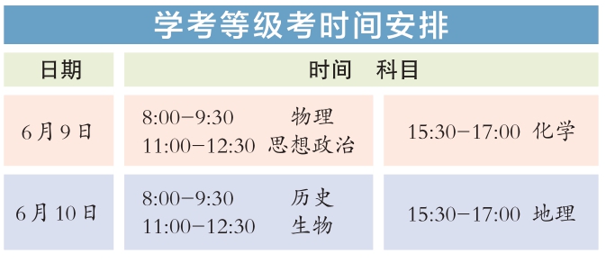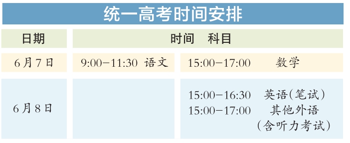 今年統(tǒng)一高考考試科目為語文、數(shù)學(xué)、外語3門,滿分均為150分。其中,英語聽說考試滿分50分,其他外語(非英語)聽力考試滿分30分,兩次聽說(聽力)考試的最高成績(jī)與其他部分試題成績(jī)一同組成外語科目成績(jī)計(jì)入高考總分。學(xué)考等級(jí)考科目為思想政治、歷史、地理、物理、化學(xué)、生物6門,由考生自主選擇3門參加考試,每科目滿分100分。參加本科招生錄取的考生總成績(jī)由3門統(tǒng)一高考成績(jī)和考生選考的3門學(xué)考等級(jí)考成績(jī)構(gòu)成,總成績(jī)滿分值為750分。