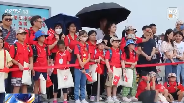 上午10時(shí),在昂船洲軍營,駐香港部隊(duì)三軍儀仗隊(duì)邁著鏗鏘有力的步伐護(hù)旗而出,伴隨著雄壯的《義勇軍進(jìn)行曲》,青少年們與解放軍官兵一起升國旗、唱國歌。在隨后的軍事課目表演中,突降大雨,官兵們頂著暴雨為現(xiàn)場(chǎng)觀眾展示了軍樂隊(duì)列、格斗技術(shù)、刺殺操、獵人戰(zhàn)斗等課目。