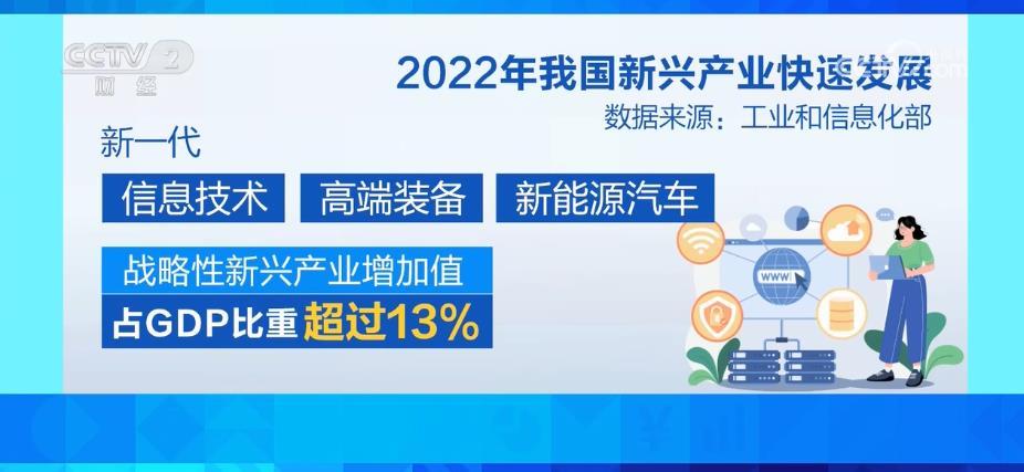 工業(yè)和信息化部部長(zhǎng)金壯龍介紹,2022年,我國(guó)新一代信息技術(shù)、高端裝備、新能源汽車等戰(zhàn)略性新興產(chǎn)業(yè)增加值占GDP比重超過(guò)13%。
