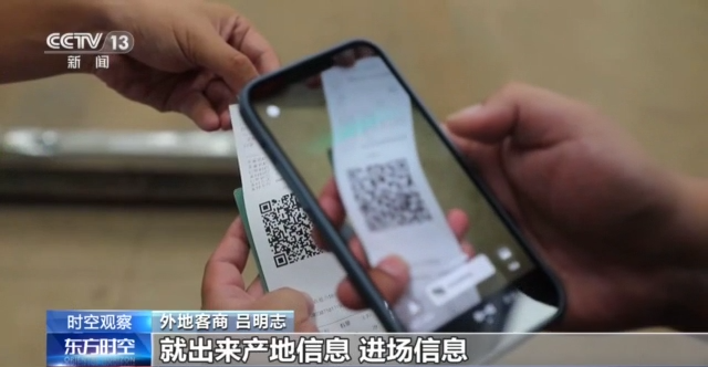 外地客商 呂明志:通過一卡通消費(fèi)了之后,掃上邊這個(gè)追溯碼,就出來(lái)產(chǎn)地信息、進(jìn)場(chǎng)信息、檢測(cè)信息,還有采摘時(shí)間,所以說現(xiàn)在很方便,比較安全。