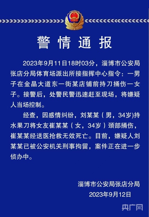 央廣網(wǎng)淄博9月12日消息(記者程立龍)9月12日,山東淄博警方發(fā)布通報稱,一男子當(dāng)街行兇致女友死亡,男子已被公安機關(guān)刑事拘留。通報原文如下: