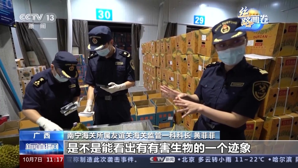 南寧海關(guān)所屬友誼關(guān)海關(guān)監(jiān)管一科科長 黃菲菲:現(xiàn)在他們主要查驗的就是榴蓮的外表面,是不是能看出有有害生物的一個跡象。當然他們同時還會對貨證相符性和證證相符性進行一個全面的檢查。比如說您看這個就是越南方面開出來的植物檢疫證書,就是為了保證榴蓮又快又好地進入國內(nèi)市場,然后讓我們的消費者能夠安心地食用。