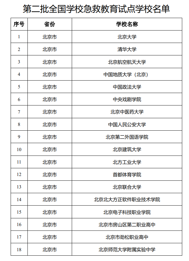 北京大學等1000所學校被確定為第二批全國學校急救教育試點學校