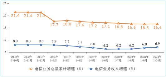 電信業(yè)務量收均實現(xiàn)小幅提升。1—10月份,電信業(yè)務收入累計完成14168億元,同比增長6.9%,增速較前三季度提升0.1個百分點。按照上年不變價計算的電信業(yè)務總量同比增長16.6%。