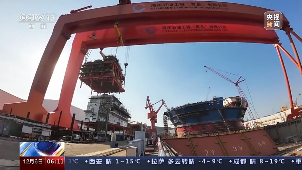 總臺央視記者 張叢婧:這里是青島海洋工程高新裝備制造基地,隨著現(xiàn)場最后一個模塊吊裝就位,意味著經(jīng)過20個月的施工,這個集原油生產(chǎn)、存儲、外輸?shù)裙δ苡谝惑w的新型“海上油氣加工廠”主體結(jié)構(gòu)建造完工,進入集成調(diào)試階段。