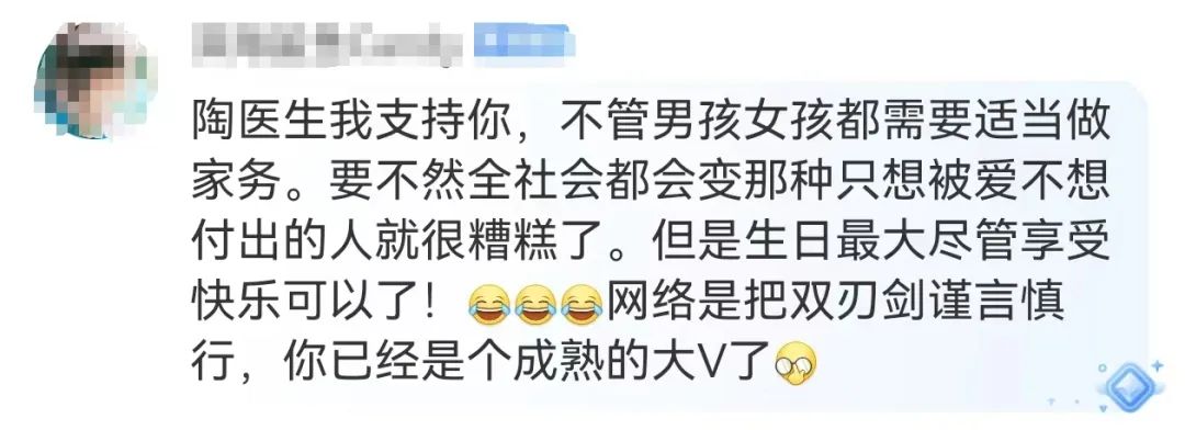 一部分網(wǎng)友認為表達了對陶勇醫(yī)生的支持:“不管男孩女孩都需要適當(dāng)做家務(wù)”“玉不琢不成器”。