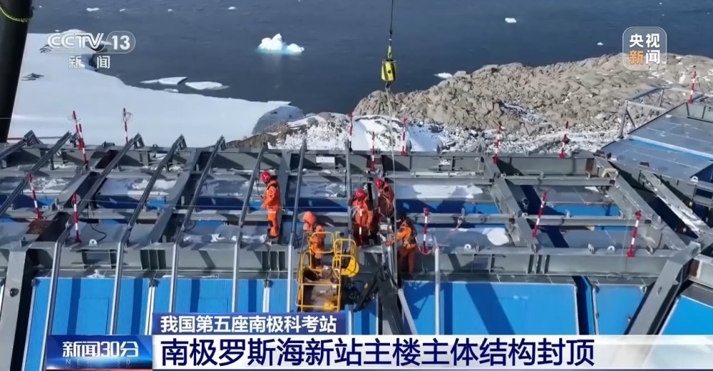 總臺(tái)央視記者 李寧:這里就是南極羅斯海新站的建設(shè)現(xiàn)場(chǎng),現(xiàn)在正在進(jìn)行吊裝作業(yè)的就是新站主樓的最后一根鋼梁。為了慶祝這個(gè)重要的工程節(jié)點(diǎn),隊(duì)員們給這根鋼梁戴上了大紅花。隨著這根鋼梁的成功吊裝,標(biāo)志著羅斯海新站的主樓主結(jié)構(gòu)完成了封頂。