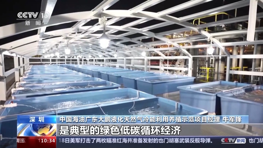 總臺央視記者 孫薊濰:我現(xiàn)在是在深圳的大鵬灣,身邊的這些藍色水箱里養(yǎng)殖著龍蝦、鮑魚等各種海鮮,養(yǎng)殖這些海產(chǎn)品的海水是廣東大鵬液化天然氣接收站的生產(chǎn)用水。