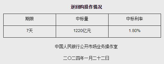 中新網(wǎng)1月22日電 據(jù)央行網(wǎng)站消息,為維護銀行體系流動性合理充裕,2024年1月22日人民銀行以利率招標方式開展了1220億元逆回購操作,中標利率1.80%,期限為7天。具體情況如下: