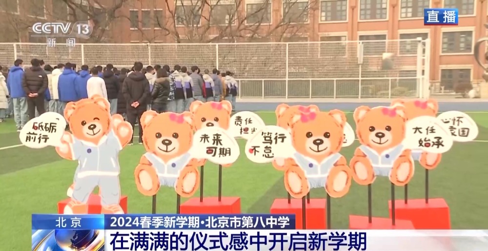 總臺(tái)央視記者 李晶晶:北京市第八中學(xué)高中部,近2300名高中生齊聚國(guó)旗下,舉行新學(xué)期的第一次升旗儀式,在滿滿的儀式感中開(kāi)啟新的學(xué)習(xí)生活。今年是龍年,有句祝福語(yǔ)叫“龍行龘龘,前程?hào)T朤”,現(xiàn)在正在進(jìn)行的國(guó)旗下的演講,題目就是《龘龘朤朤間是向上的力量》,老師祝福學(xué)生們像龍一樣騰飛而上,同時(shí)也是鼓勵(lì)他們要有夢(mèng)想,為實(shí)現(xiàn)夢(mèng)想不斷努力向上。