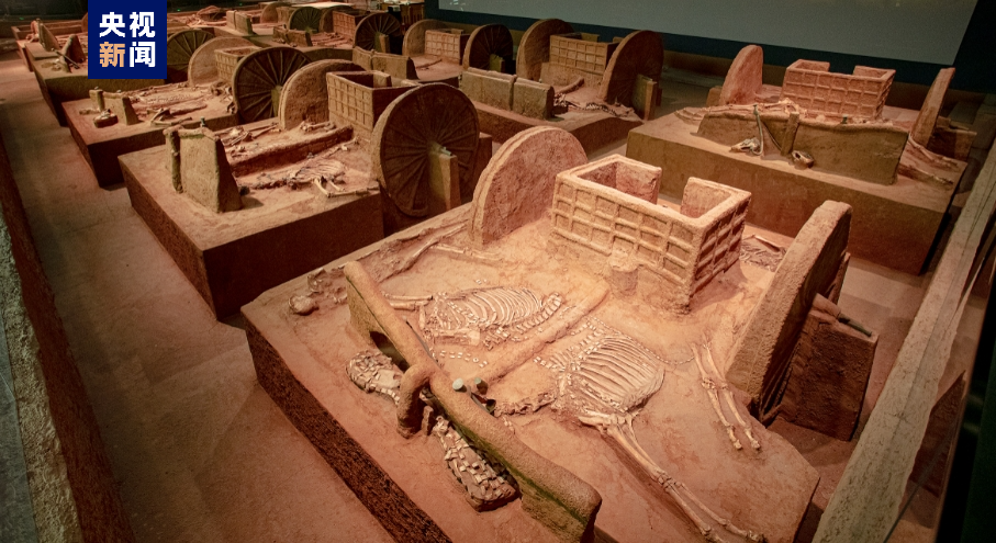 “車轔轔馬蕭蕭”殷墟車馬遺跡展,展廳內(nèi)23座車馬坑遺跡,矩陣式陳列,氣勢(shì)震撼。展示了商代裝飾華麗、結(jié)構(gòu)精巧、機(jī)動(dòng)靈活的馬車,是中國目前所見最早的馬車實(shí)物標(biāo)本,更是對(duì)三千多年前商文明的生動(dòng)詮釋。經(jīng)過近百年探索,殷墟發(fā)掘車馬坑九十余座,再現(xiàn)了商代馬車面貌。馬車不僅作為王室貴族的代步工具,也在驛站傳遞、田獵出行、載兵作戰(zhàn)等方面發(fā)揮著重要作用。殷墟馬車多埋于大型墓葬附近或墓道內(nèi)、以車、馬、人合葬居多。殷墟早期以車馬器陪葬,車馬器套數(shù)代表主人所擁有的馬車數(shù)量,見證著主人身份等級(jí)的高低;晚期馬車陪葬成為中、上級(jí)貴族的專屬,彰顯著墓主人的赫赫權(quán)威,亦是馬車陪葬制度的萌芽。