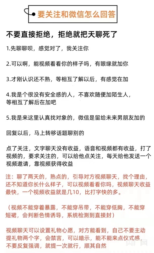 記者注意到,“使用手冊(cè)”第一頁(yè)聲明中稱(chēng),只參與軟件推廣,不涉及套路教學(xué)、虛假聊天、誘導(dǎo)充值。當(dāng)記者對(duì)是否能賺到錢(qián)表示擔(dān)憂時(shí),該推廣員發(fā)來(lái)一份“社交聊天日入千元攻略”,包含怎樣設(shè)置頭像、如何引導(dǎo)對(duì)方視頻聊天、如何拒加微信等信息。