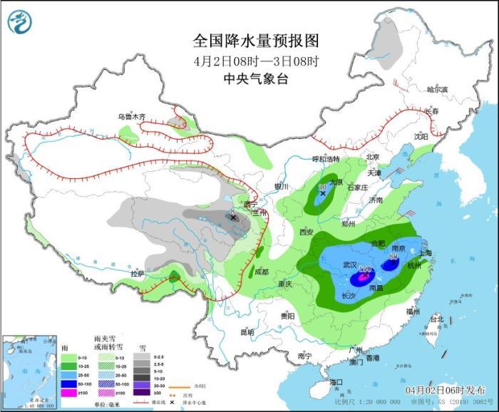 4月2日08時至3日08時,內(nèi)蒙古東北部、西藏東部、甘肅河西、青海中南部、川西高原北部等地部分地區(qū)有小雪或雨夾雪,其中,西藏東南部、青海東南部、甘肅西南部等地部分地區(qū)有中到大雪(5~8毫米)。陜西東部、山西西部、黃淮南部、江淮大部、江漢、江南北部、四川盆地東部、重慶東北部等地部分地區(qū)有中到大雨,其中,湖北東南部、湖南東北部、安徽東南部、江西東北部等地部分地區(qū)有暴雨,局地大暴雨(100~150毫米)。內(nèi)蒙古東北部部分地區(qū)有4~5級風(fēng)。