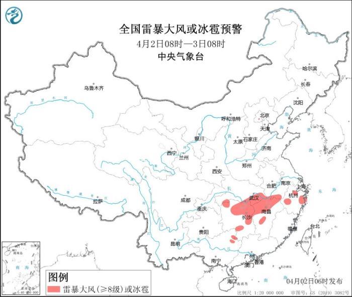 全國雷暴大風(fēng)或冰雹預(yù)警(4月2日08時-3日08時)