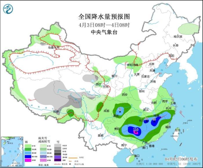 4月3日08時至4日08時,新疆北疆北部和伊犁河谷沿天山一帶、西藏北部、青海東北部和南部、甘肅河西、川西高原北部、黑龍江東部等地部分地區(qū)有小到中雪或雨夾雪。江南中南部、西南地區(qū)東北部、華南北部等地部分地區(qū)有中到大雨,其中,湖南西南部、江西中部、廣西東北部、廣東西北部等地部分地區(qū)有暴雨或大暴雨(100~110毫米)。內(nèi)蒙古河套地區(qū)和中部、新疆沿天山地區(qū)、西藏南部等地部分地區(qū)有4~5級風(fēng)。