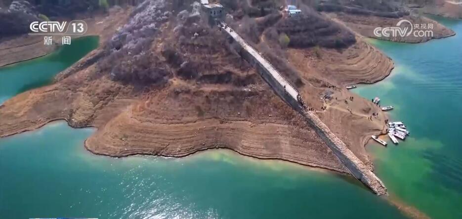 您現(xiàn)在看到的是位于河北省寬城滿族自治縣境內(nèi)的潘家口水庫“水下長城”。長城內(nèi)外,漫山遍野的山杏花悄然綻放,在春風(fēng)中爭芳斗艷,時(shí)而飄來陣陣花香。春日里,盛開的杏花、碧綠的湖水與巍峨的長城交相輝映,形成了剛?cè)嶂赖耐昝廊诤希瑯?gòu)成一幅絕美的畫卷,吸引了眾多游客登上長城前來賞花踏青。