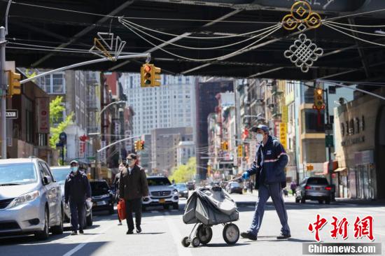 當?shù)貢r間5月12日,紐約曼哈頓唐人街,華人郵遞員正在投遞郵件。隨著近期紐約新冠肺炎疫情漸緩,紐約華人社區(qū)街頭行人逐漸增多。