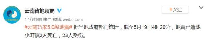 中新網(wǎng)5月19日電 據(jù)云南省地震局官方微博消息,據(jù)當(dāng)?shù)卣块T統(tǒng)計,截至5月19日4時20分,地震已造成小河鎮(zhèn)2人死亡,23人受傷。
