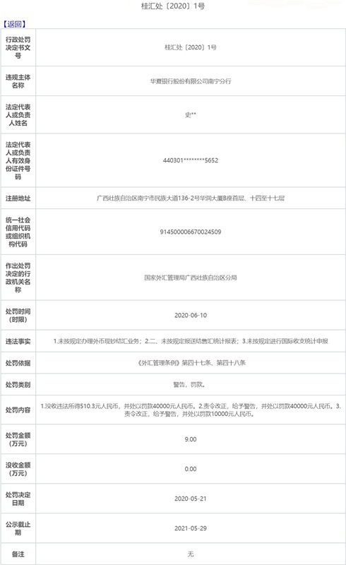 華夏銀行南寧分行三宗違法遭罰 違規(guī)辦理外幣現(xiàn)鈔結匯
