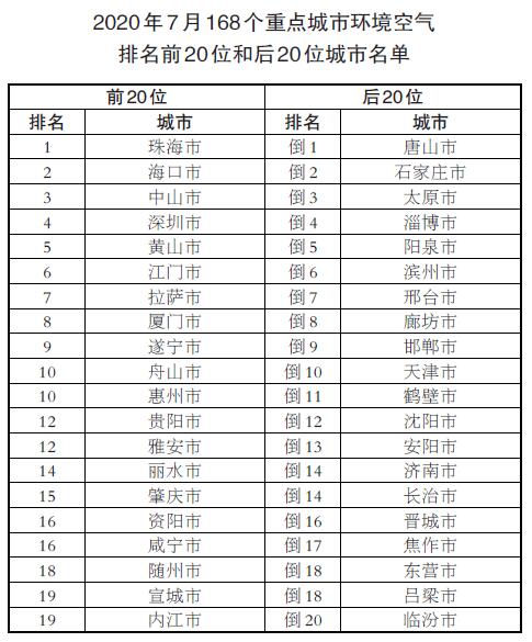 7月,168個(gè)重點(diǎn)城市中唐山、石家莊和太原市等城市空氣質(zhì)量相對較差;珠海、海口和中山市等城市空氣質(zhì)量相對較好。