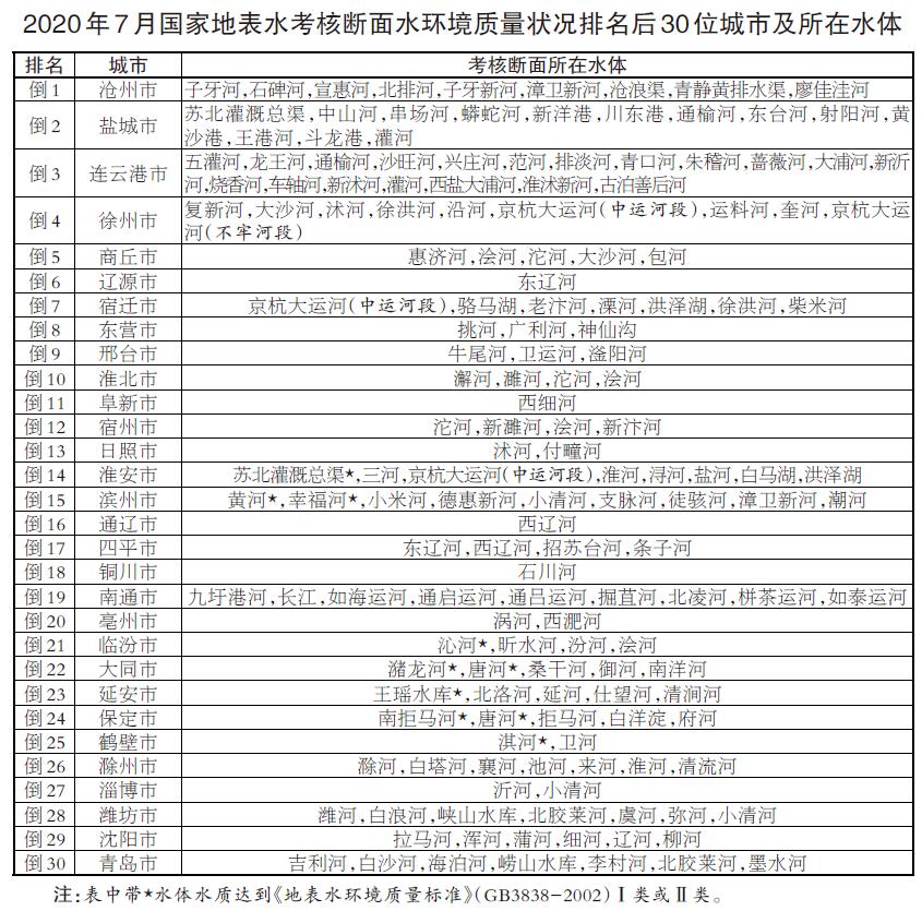 參加排名的全國地級及以上城市,覆蓋2050個(gè)國控?cái)嗝妫ㄆ渲?940個(gè)為國家地表水考核斷面,110個(gè)為入??刂茢嗝妫?。7月,全國地級及以上城市中,河池、柳州、桂林等30個(gè)城市國家地表水考核斷面水環(huán)境質(zhì)量相對較好,滄州、鹽城、連云港等30個(gè)城市國家地表水考核斷面水環(huán)境質(zhì)量相對較差;1-7月,全國地級及以上城市中,張掖、金昌、柳州等30個(gè)城市國家地表水考核斷面水環(huán)境質(zhì)量相對較好,銅川、滄州、邢臺等30個(gè)城市國家地表水考核斷面水環(huán)境質(zhì)量相對較差。